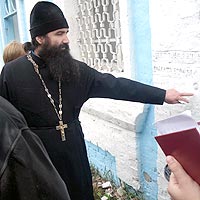 Густой слой побелки с северной стороны собора Ядрина не закрыл едва различимую надпись и большую металлическую точку, похожую на шляпку гвоздя. Настоятель храма отец Сергий читает вслух незамысловатый текст: «В 1926 году 1 мая 84 метра воды в реке Сура». И никаких пояснений.