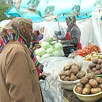 На вопрос, как идет торговля, одна из продавщиц ответила с сожалением: “Не очень-то бойко. Покупатели капризничают, жалуются и на цены, и на качество. Вот, например, помидоры в этом году не уродились — погода, видимо, не та. Привозят их из Саратова и Волгограда, из-за стоимости перевозок взлетает и цена”. Но, видимо, не все от транспорта зависит. Сейчас привозные помидоры идут от 23 до 30 рублей за кг, а свои, местные, — и того дороже, по 45 рублей за килограмм. Но все равно это примерно на треть дешевле, чем в магазинах.