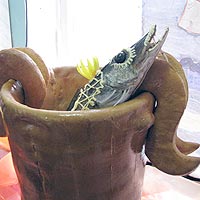и украшенные столы. Но пробовать аппетитные блюда было нельзя — это выставка. Студенты со второго, третьего, четвертого и пятого курсов демонстрировали свое мастерство в приготовлении салатов, бутербродов, закуски. Даже из обыкновенных спагетти умудрились выложить целый зоопарк: тут — птица, там — мордашка слона. Арбузные вазы с фруктами и ягодами, тыквенные горшочки с рисом притягивают взгляд и вызывают повышенное слюноотделение. «Все блюда тут — это наша фантазия, экспромт, — рассказал один из создателей выставочных экспонатов. — Но все съедобно!» Фантазия у студентов колледжа оказалась разнообразная: в одном из пирогов они запекли по особой технологии бутылку с горячительным напитком, а в съедобное ведро поместили щуку, ту, что «по щучьему веленью, по моему хотенью».