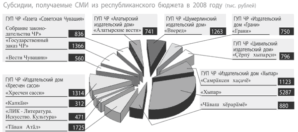 Вот лишний пример того, что даже некоторые официальные лица «плавают» в вопросах финансирования печати. Согласно упомянутому реестру, утвержденному распоряжением правительства республики, ГУП «Газета «Советская Чувашия», которое, напомним, кроме «СЧ» издает еще семь газет, средства действительно выделяются. Но в том же документе указываются и конкретные адреса финансирования: это — официальные публикаторы различных документов, газеты «Вести Чувашии», «Государственный заказ Чувашской Республики», «Собрание законодательства Чувашской Республики». Естественно, предусматривается только целевое использование этих денег, хотя все эти СМИ входят в наш издательский холдинг, имеющий один расчетный счет. Да и что перераспределять, если объем наиболее урожайных номеров этих газет порой доходит до 100 страниц! Тут уж не до жиру. А о каком-то субсидировании непосредственно газеты «Советская Чувашия» в реестре и речи не идет.