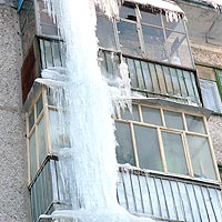 «Сосульки у нас, конечно и раньше висели, да не такие — говорит одна из жительниц дома, пенсионерка Ольга Захаровна. — А летом чинили крышу и в двух местах настил, видно, неровный сделали. Зимой оно и аукнулось. Вон, посмотрите, между четвертым и пятым подъездом ледяной нарост на стене. И в третьем подъезде балконы льдом заросли: окна людям с топором приходится открывать». «86 лет на свете живу, никогда такого не видела, — вторит ей другая пенсионерка. — Вообще дом наш невезучий. Все обветшало, коммунальщики, что его обслуживают, каждый год меняются».