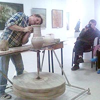 Весьма любопытно было побывать на мастер-классе по гончарному делу — это ведь одно из древнейших искусств. Показательное занятие провел художник-керамист Михаил Садовников в Чувашском художественном музее. Собралось немало желающих посмотреть на «живую глину».